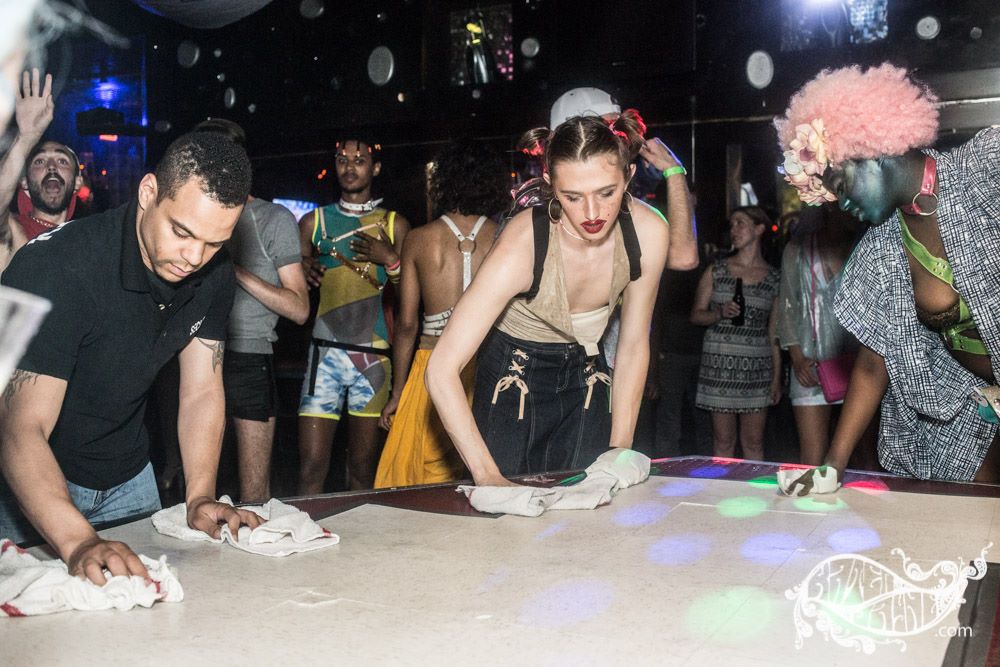 Linoleum tile, tape, mirrors, fluorescent light and acrylic on tablecloth with performer Compton Quashie.